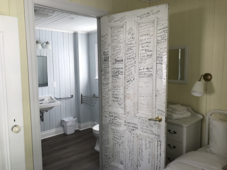 All of the flooring was leveled and redone. A wheelchair user can now go anywhere on the ground floor. We even kept an inside door used by aunt Thérèse to write different notes. The door, pictured below, gives access to the handicapped-friendly bathroom.